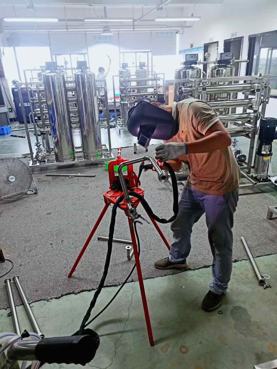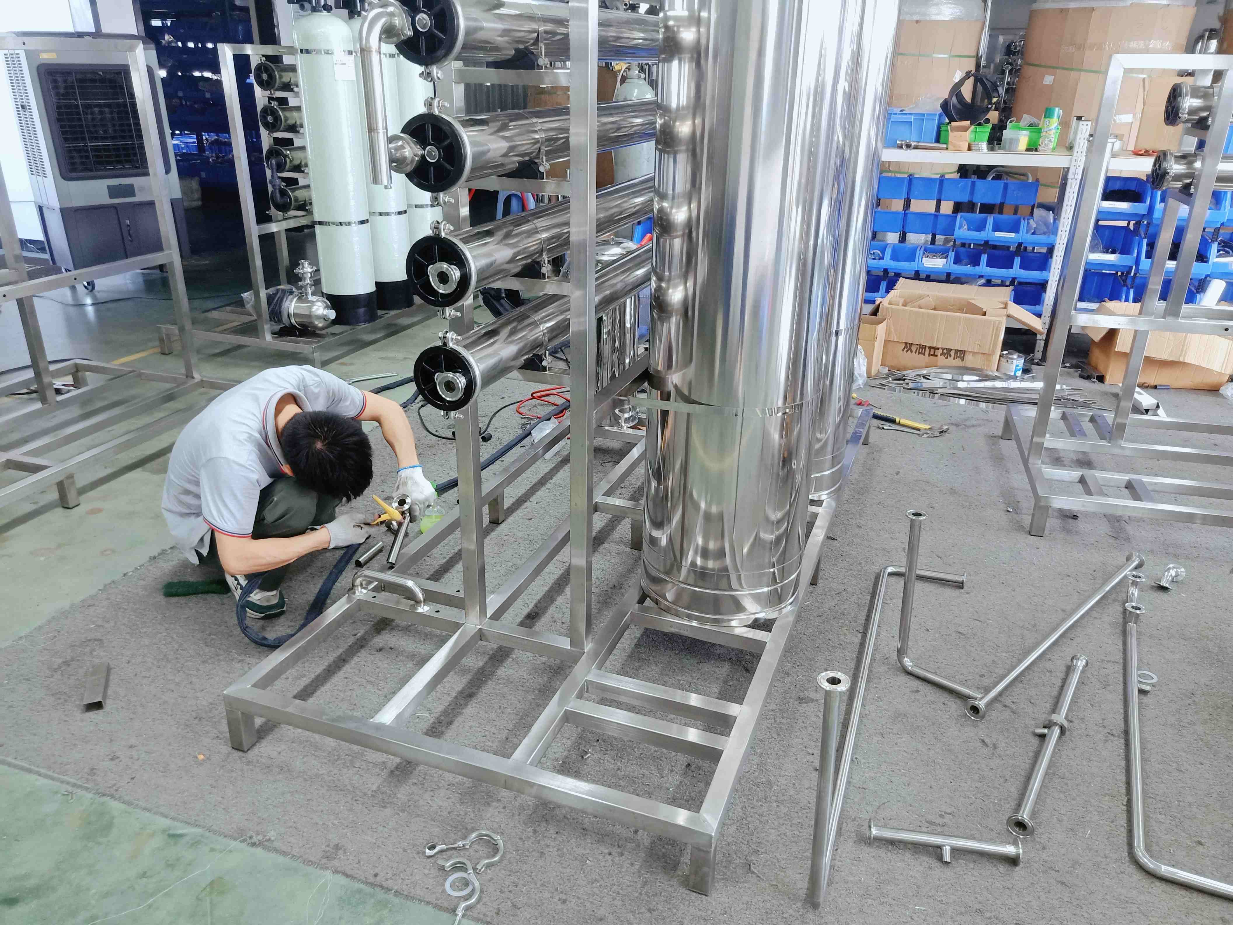 走進生產(chǎn)車間,機器的轟鳴聲不斷,員工們正緊張有序地在各自的工作崗位忙碌著,下料、沖壓、焊接、安裝、接線、調(diào)試、打包等工序有條不紊,一套套水處理系統(tǒng)正源源不斷地生產(chǎn)出來,生產(chǎn)現(xiàn)場秩序井然。