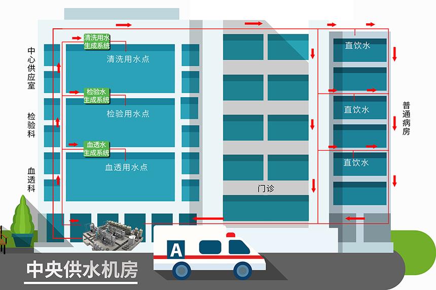 醫(yī)院中央集中分質(zhì)供水系統(tǒng)是將醫(yī)院用水整合為一個集中平臺,結(jié)合不同科室醫(yī)療用水標(biāo)準(zhǔn)進行分質(zhì)供水的系統(tǒng)。通過獨立的管道,將不同水質(zhì)的用水分別輸送到對應(yīng)科室,隨用隨取,方便衛(wèi)生。