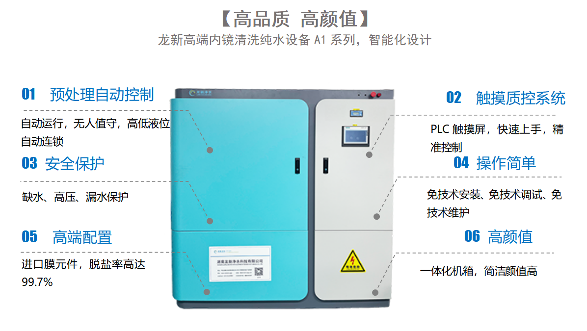 內(nèi)鏡清洗純水設(shè)備A1系列原水水質(zhì)是市政自來水、水質(zhì)指標(biāo)符合GB/5749生活飲用水衛(wèi)生標(biāo)準(zhǔn);產(chǎn)水電導(dǎo)率<15us/cm,水質(zhì)符合《軟式內(nèi)鏡清洗消毒技術(shù)規(guī)范》WS507-2016用水指標(biāo)軟式內(nèi)鏡清洗消毒細(xì)菌總數(shù)≤ 10 CFU/100 mL,濾膜孔徑(定期更換)≤ 0.2 μm。